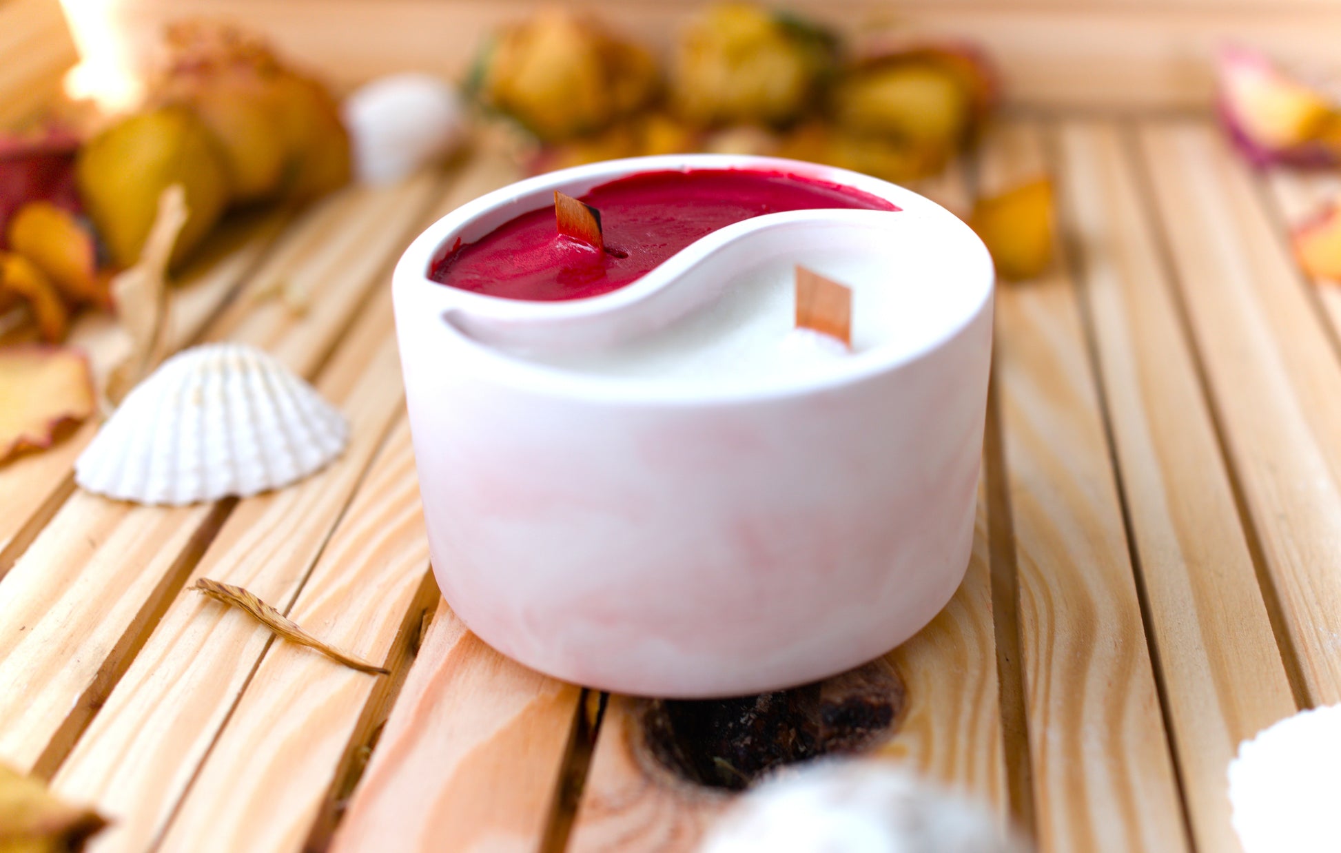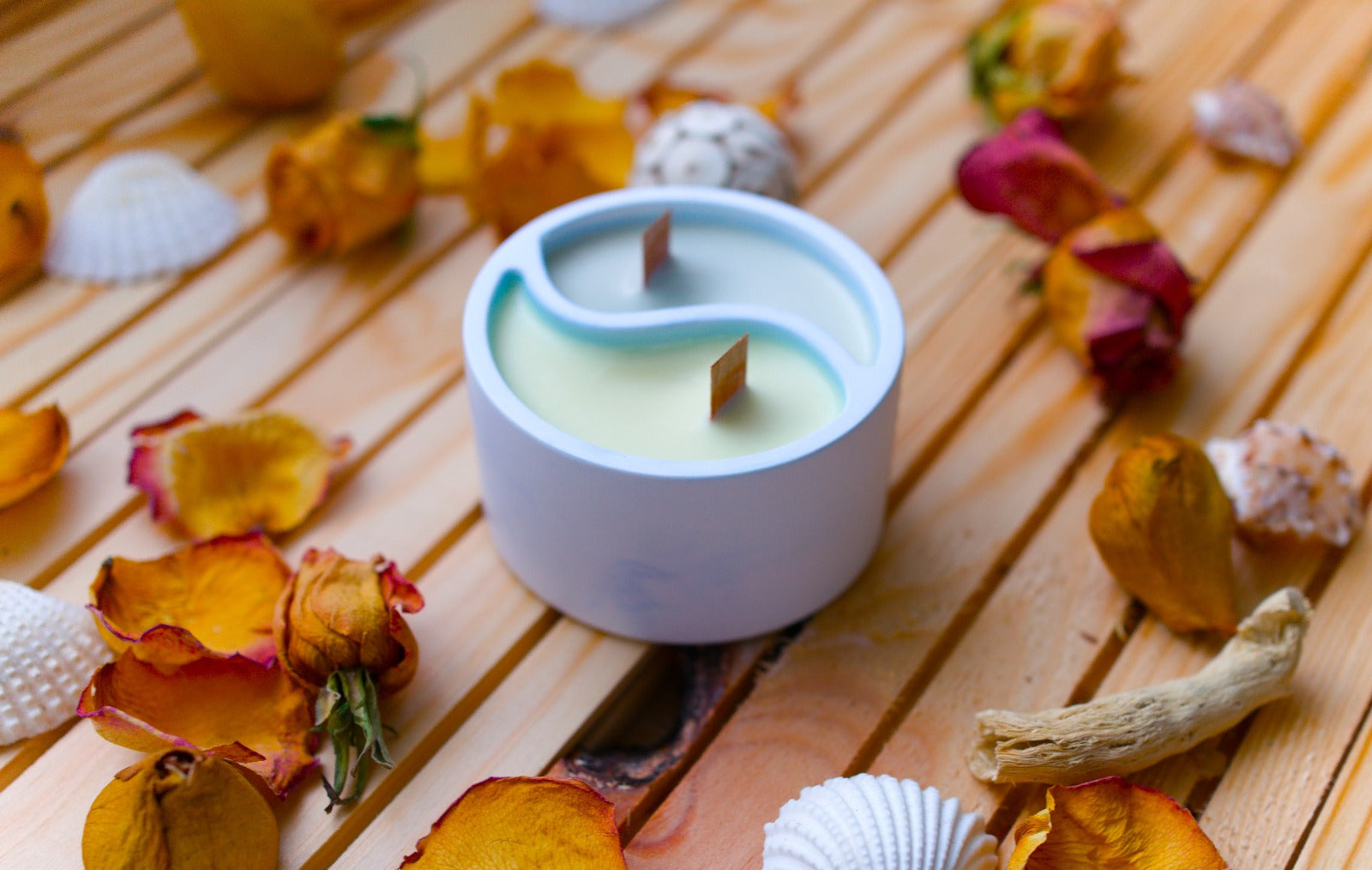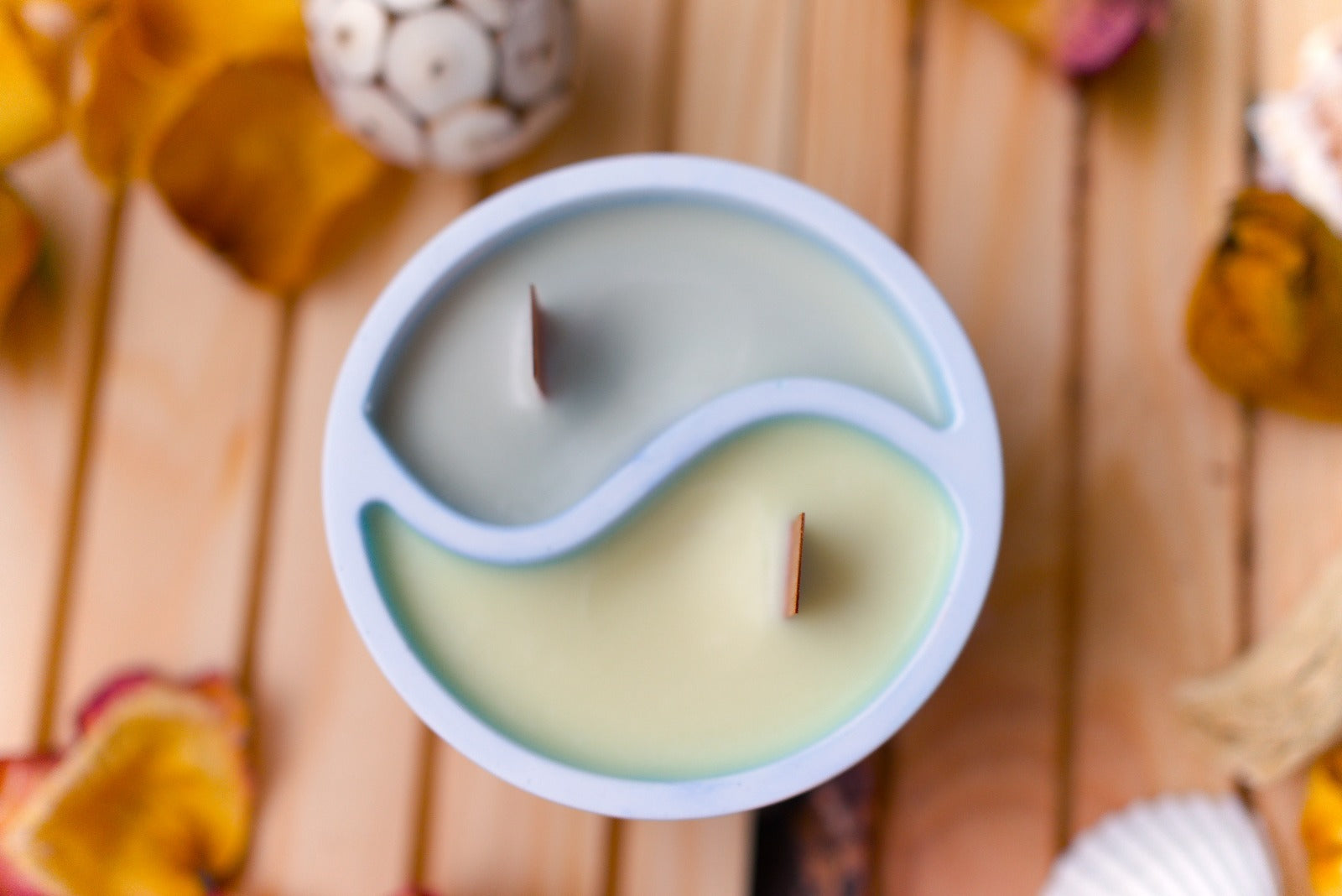 Bougie yin-yang artisanale – Cire végétale et mèches en bois
