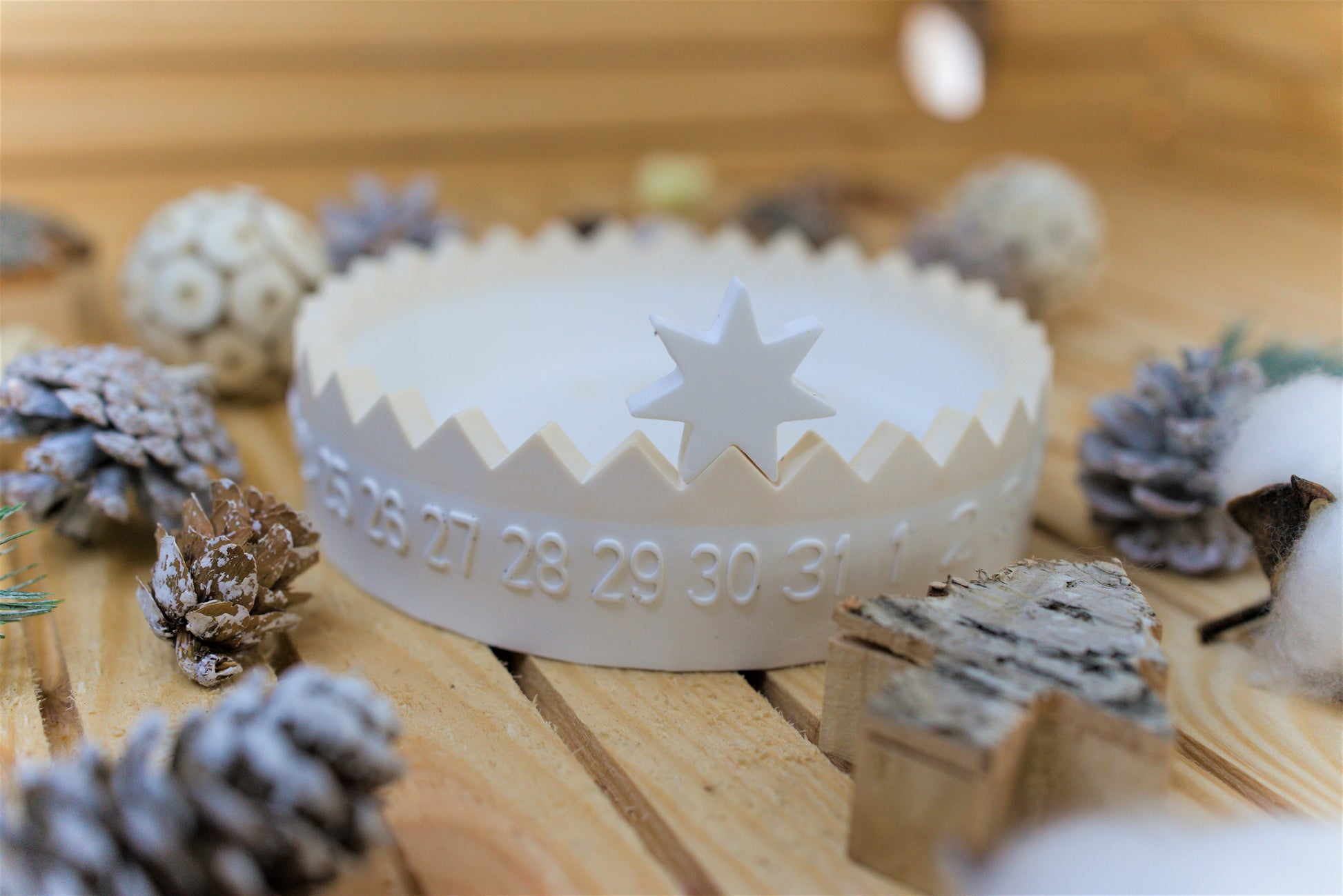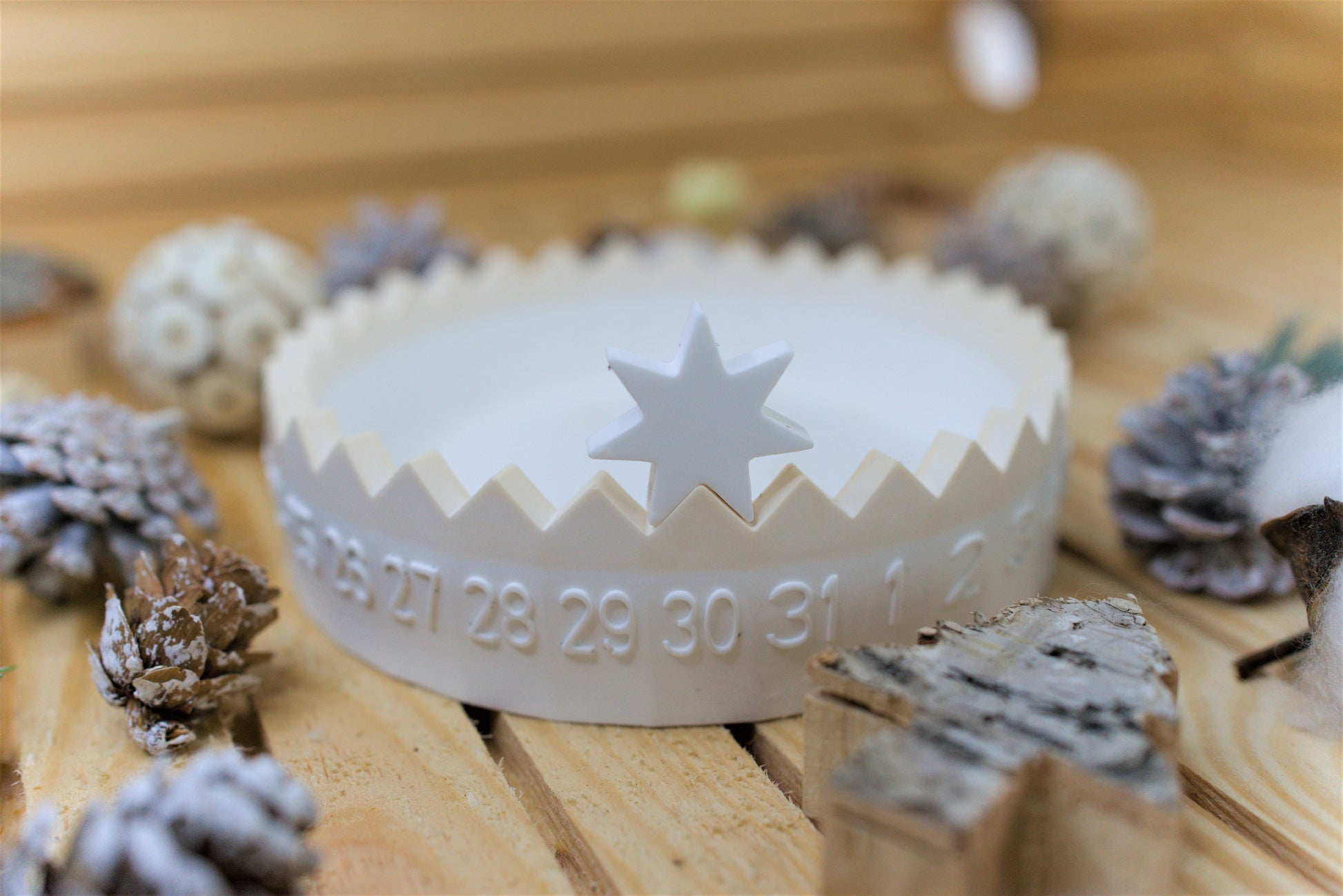 Comptez les jours avec élégance grâce à ce calendrier original en céramique. En forme de coupelle, il est décoré d’inscriptions représentant les jours du mois. Une petite étoile mobile permet de marquer la date souhaitée.